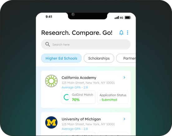 At GoGira!, we empower you to uncover your talents and values, aligning you with personalized career opportunities, financial aid, and educational paths that light the way forward. The GoGira! Intelligence Match system lets you explore diverse careers, engage with higher education institutions, and discover financial aid opportunities—all tailored to help you find your ideal path, whether it's academic, vocational, or in between.